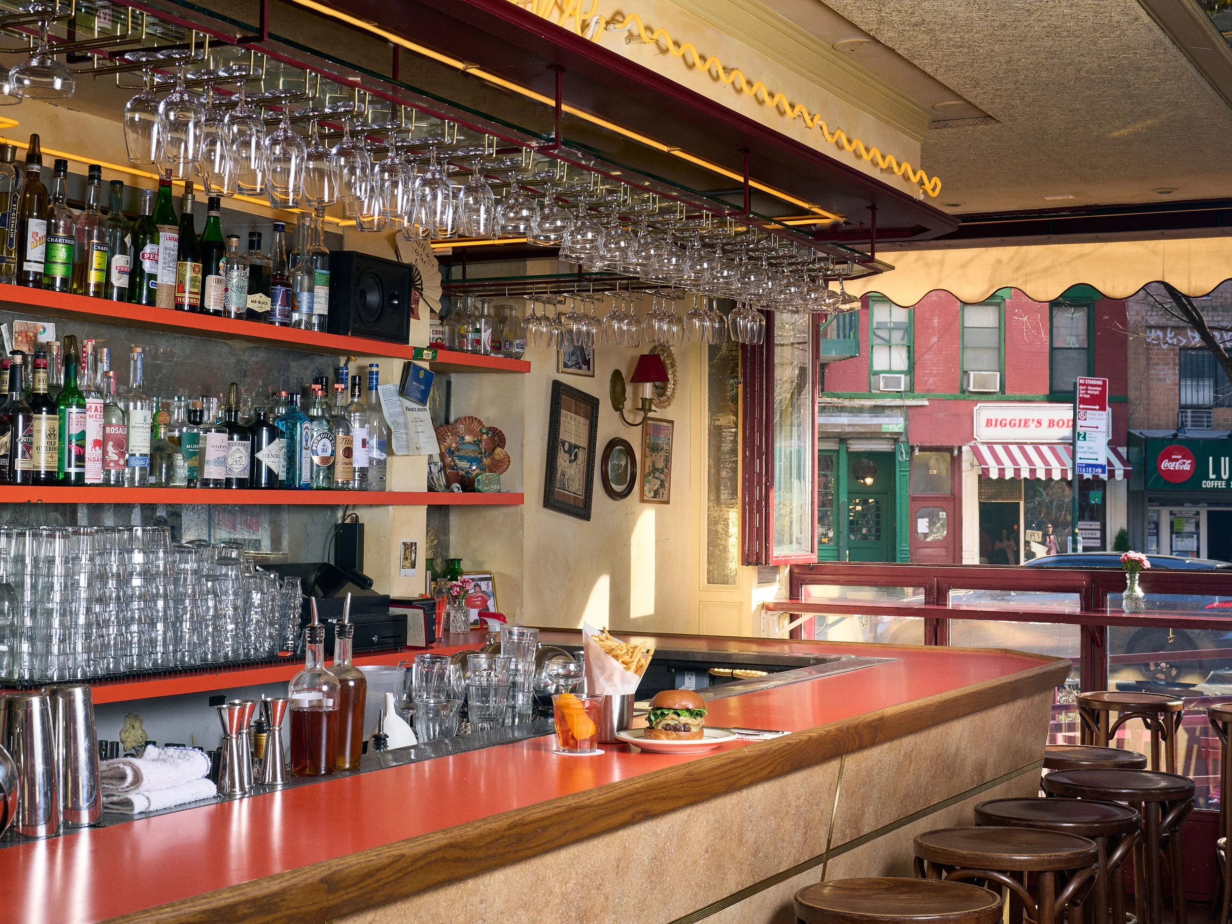 “But after dark, its red and green neon sign casts a glow onto East Houston Street as negronis fly from its zinc and Formica bar, akin to a scene from Jay McInerney’s Bright Lights, Big City.”