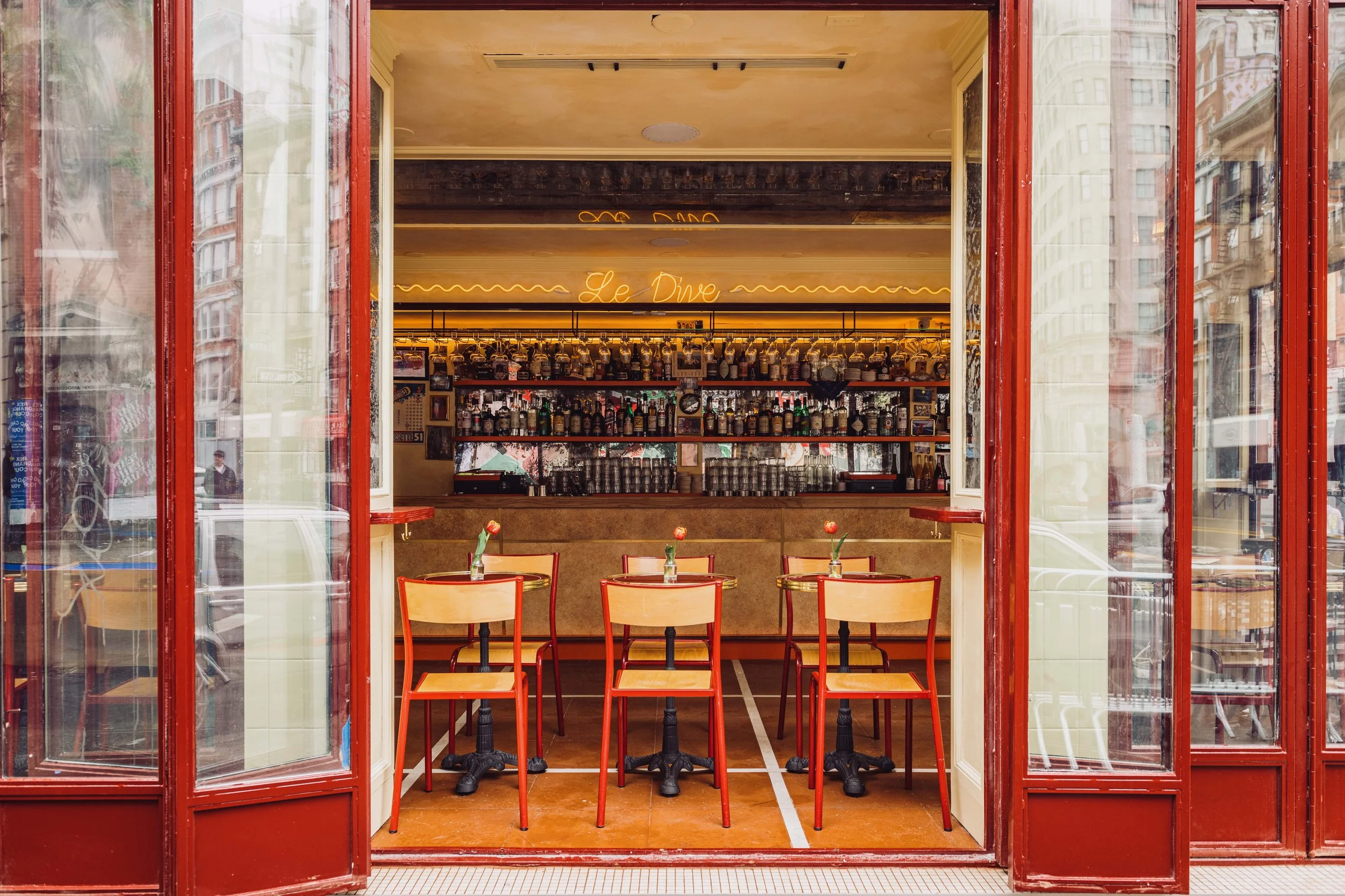 Le Dive channels Parisian bohemian tabacs in New York’s LES Dimes Square. This natural wine bar features vintage French chairs, Bordeaux tables, and a glowing golden neon sign. Offering natural wines, crafted cocktails, and refined small plates, Le Dive is a premier destination for all-night social gatherings.