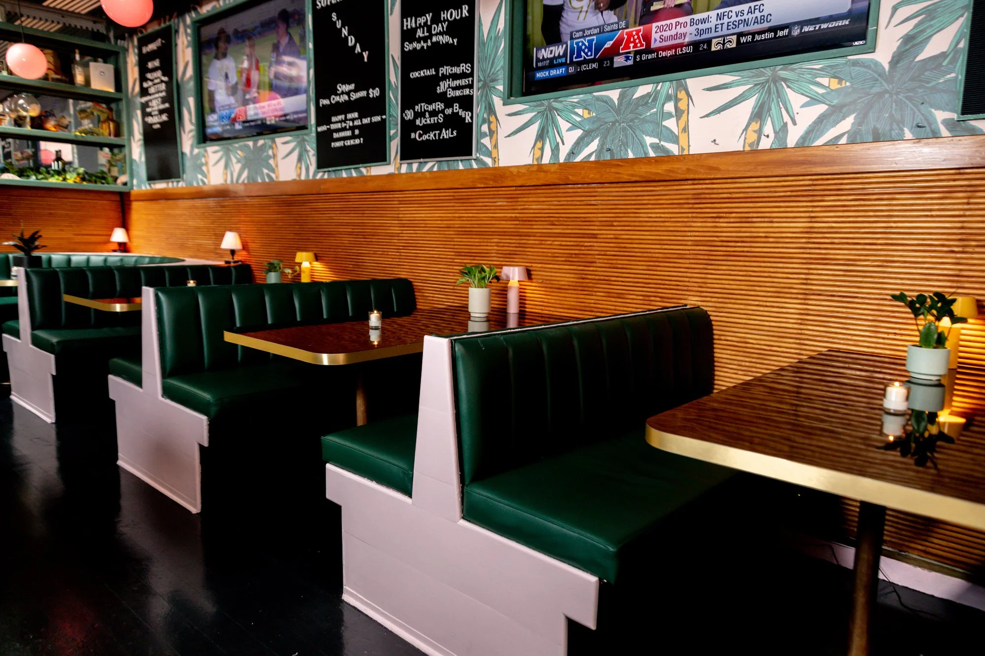 The Happiest Hour is a West Village bar and restaurant known for its vibrant atmosphere, crowd-friendly cocktails, and cult-favorite burgers. Green banquettes, palm wallpaper, and low lighting set the scene for casual gatherings, while a flexible drinks menu and lively horseshoe bar keep the energy going well past happy hour.