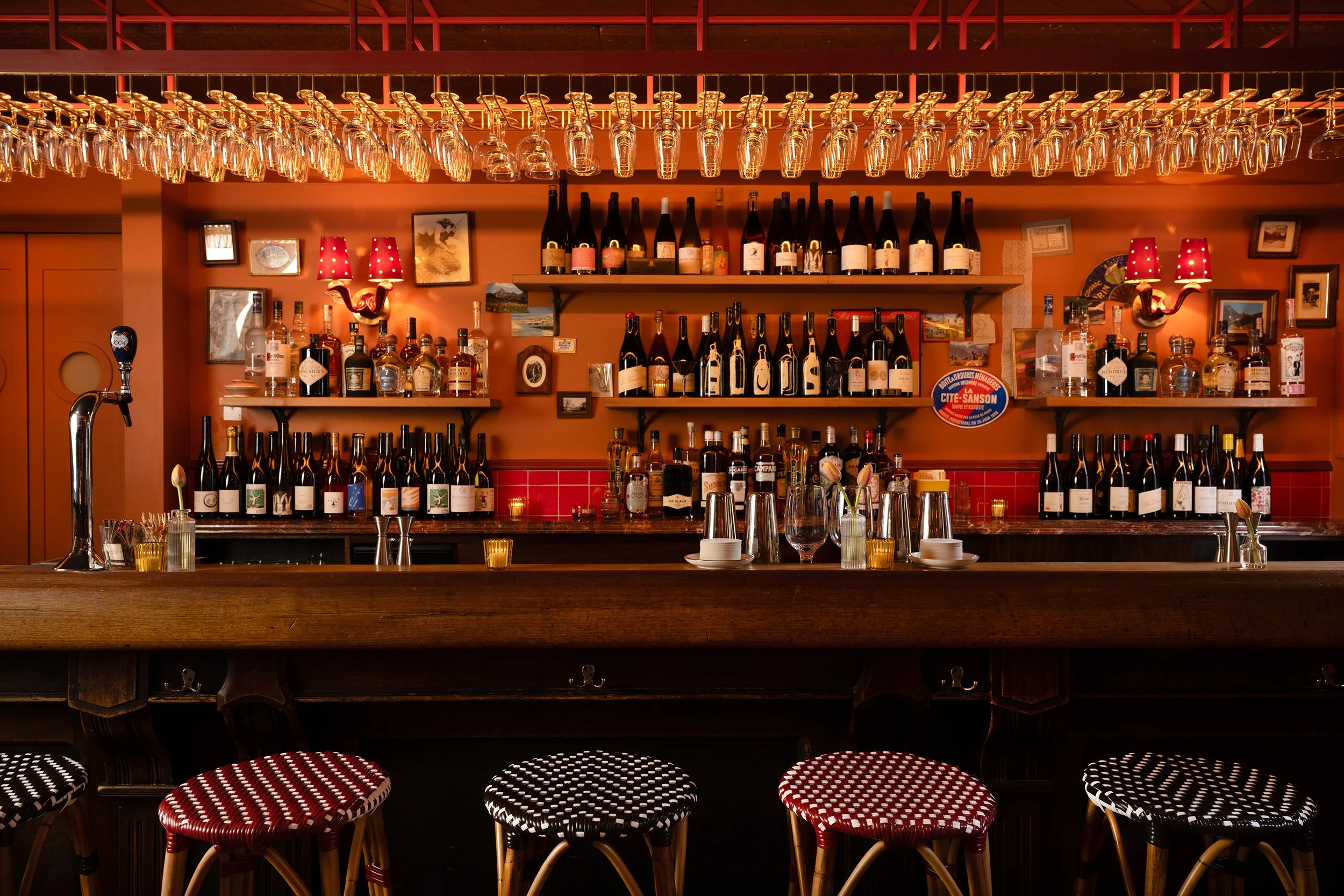 Elvis occupies the former Great Jones Café space, featuring the original 35-year-old bar, bold orange walls, and red tile accents. The intimate 30-seat interior includes custom French rattan stools, red marble ledges, and a 17-foot illuminated glass rack. Seasonal outdoor seating evokes a classic European café atmosphere.